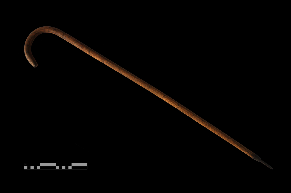Vycházková hole z bambusu, obyčejná, vyrobená z bambusového stonku, nebarvená, nelakovaná. Na konci hole je kovová špice, úchopová část hole je zahnuta. Nezdobeno. Pouze jsou viditelné přírodní kroužky bambusu při jeho růstu.