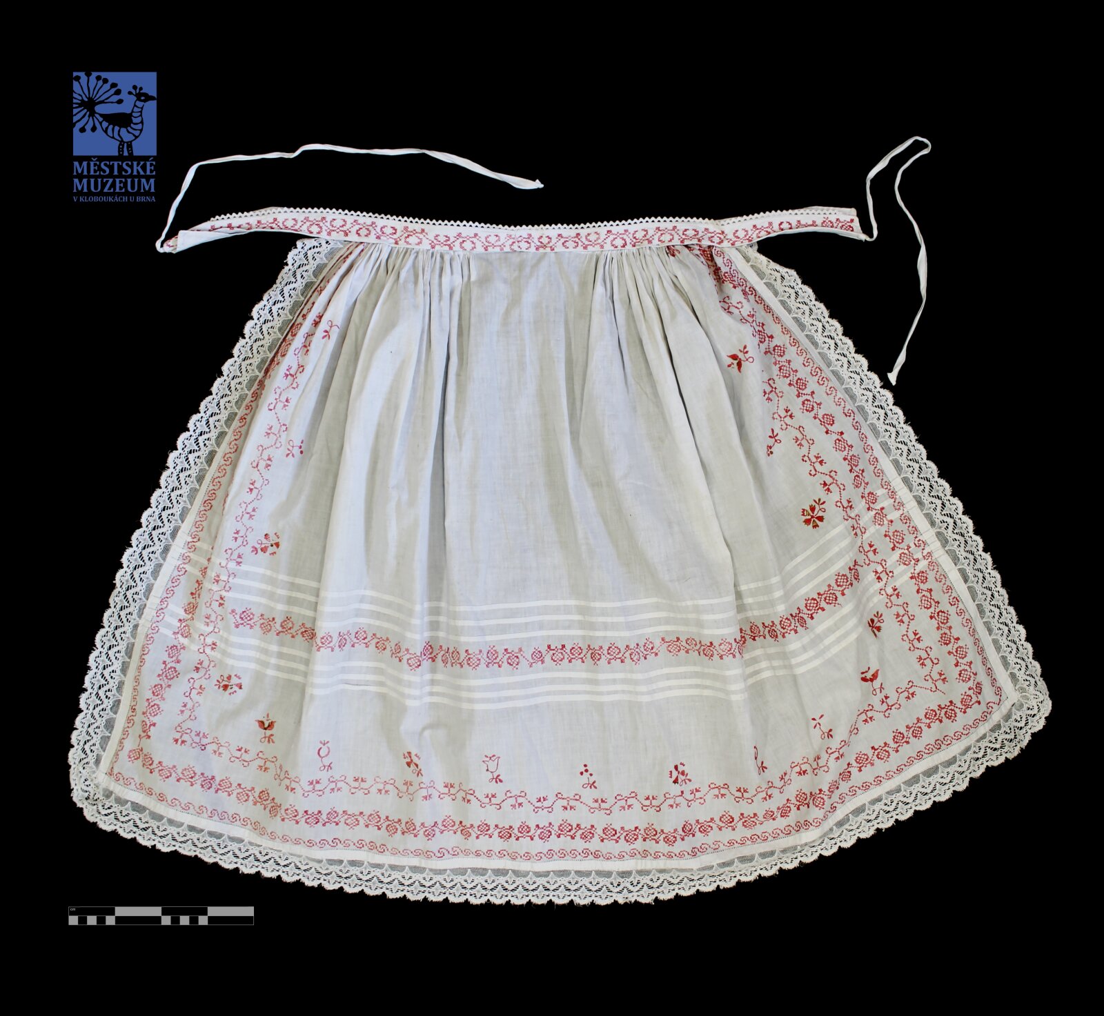 Záštěra plátěná, bílá s červenou křížkovou výšivkou, řezenou ve 3 pásech nad sebou podél okrajů. Okraje jsou začištěny hrachovinkou, je k nim našita jemná krajka. Zástěra je navrapovaná do širokého přesahujícího pásku s našitými keprovkami. I pásek je vyšit řadou granátových jablíček s lístky, k jeho hornámu okraji je našita vlnovka. V dolní polovině zástěry jsou 2 řady 3x se opakujících sámků. Vzor tvoří řada volut, vlnovka s granátovými jablky, vlnovka s úponky, střídajícími se plátk. květy/červeno-hnědými, plochý steh/s úponky