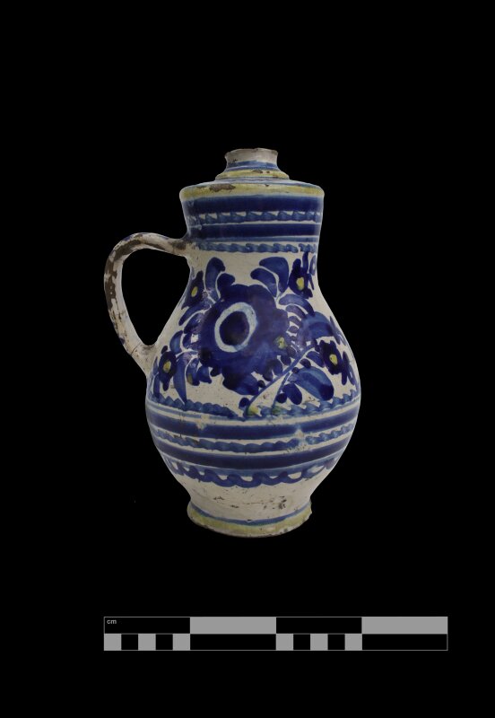 tzv. sova. Tvar charektestický, v místě nasazení plochého ucha na stěnu je hmatatelný otisk prstu. Základní dekor modrý, doplňky žluté. Po obou strannách ucha velký modrý květ, kolem něj pět poupat se žlutým středem na stoncích s listy. Hrdlo, spodní část stěn zdobena proužky a vlnovkami, patka žlutým a modrým proužkem.