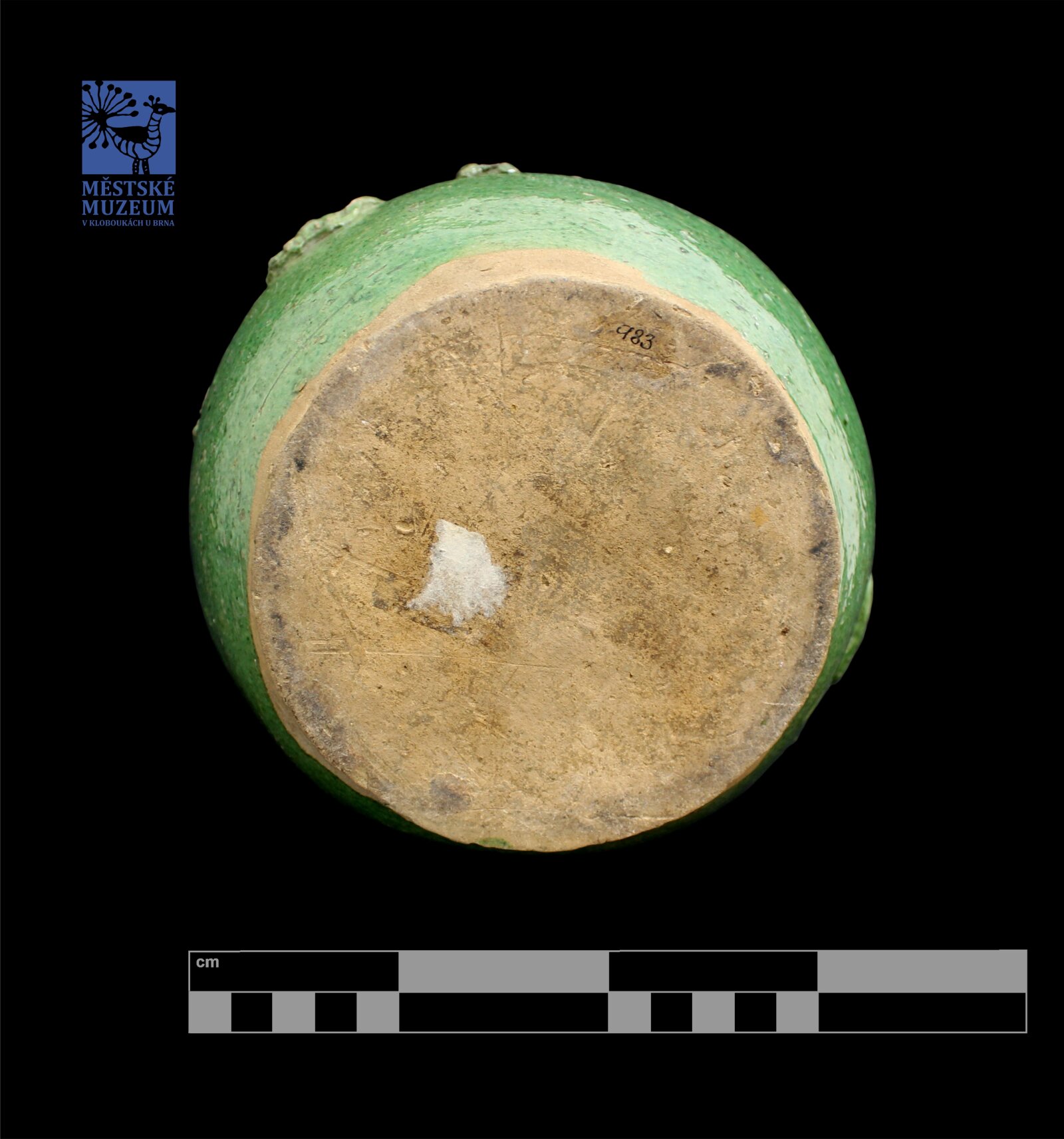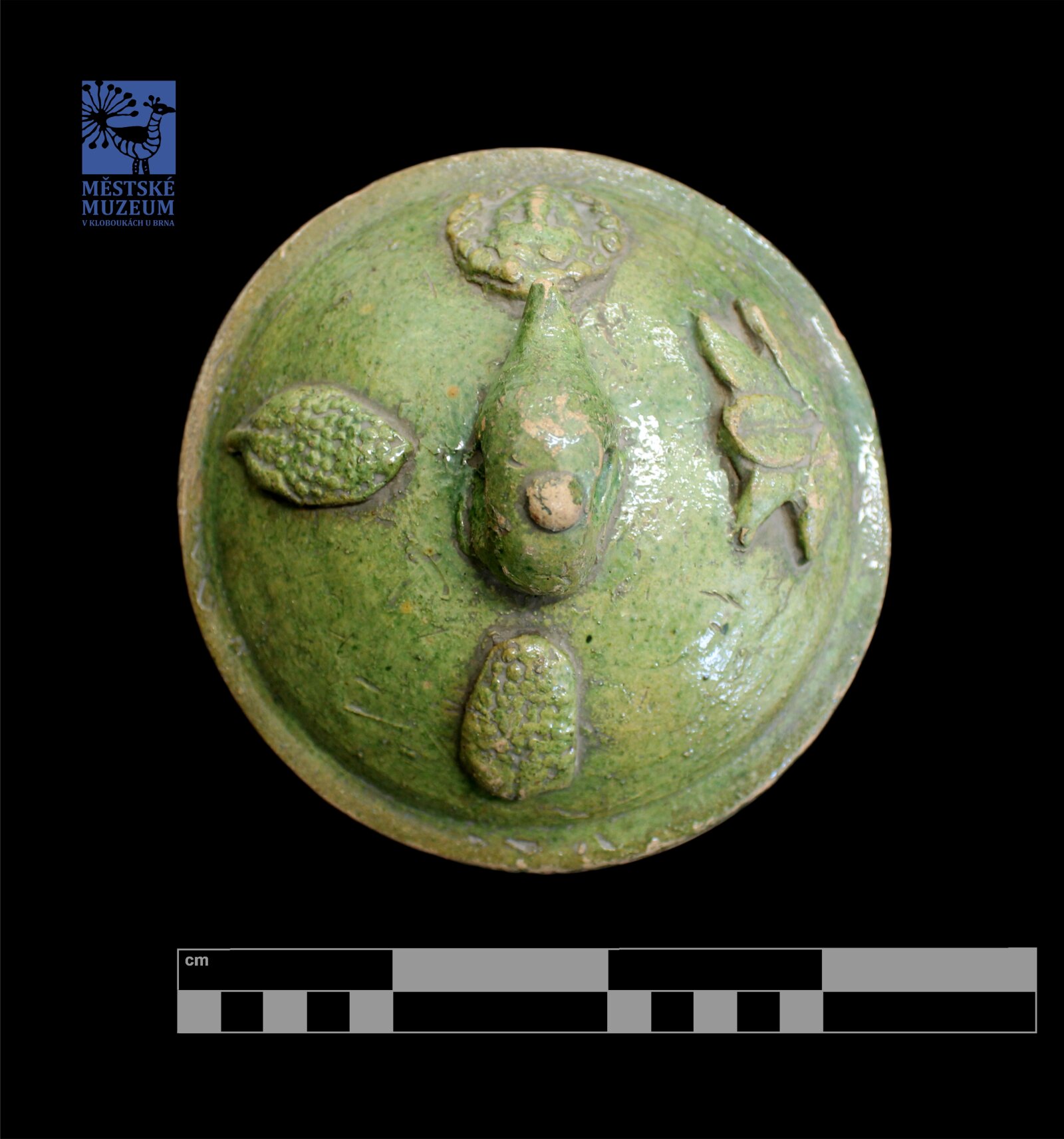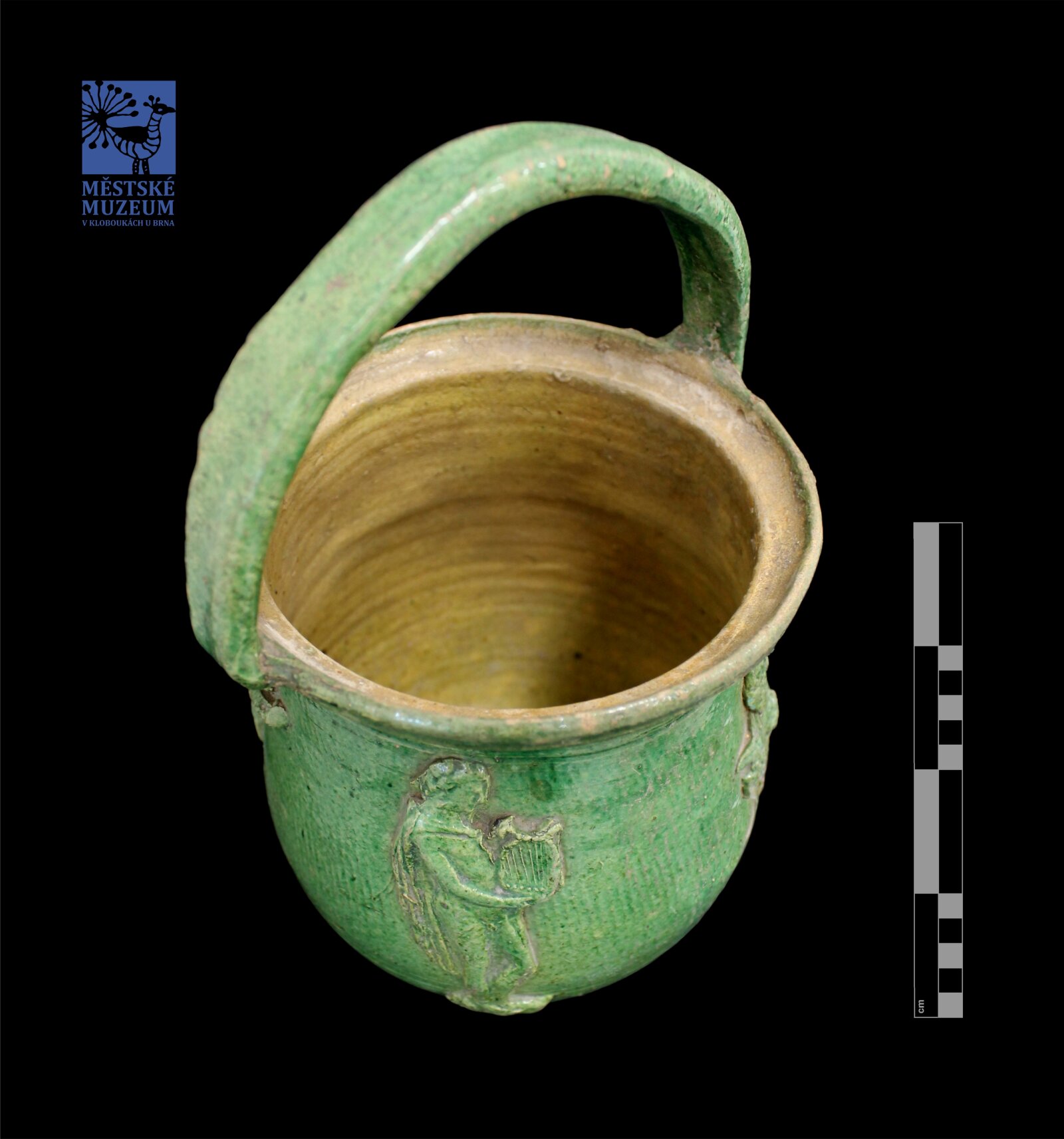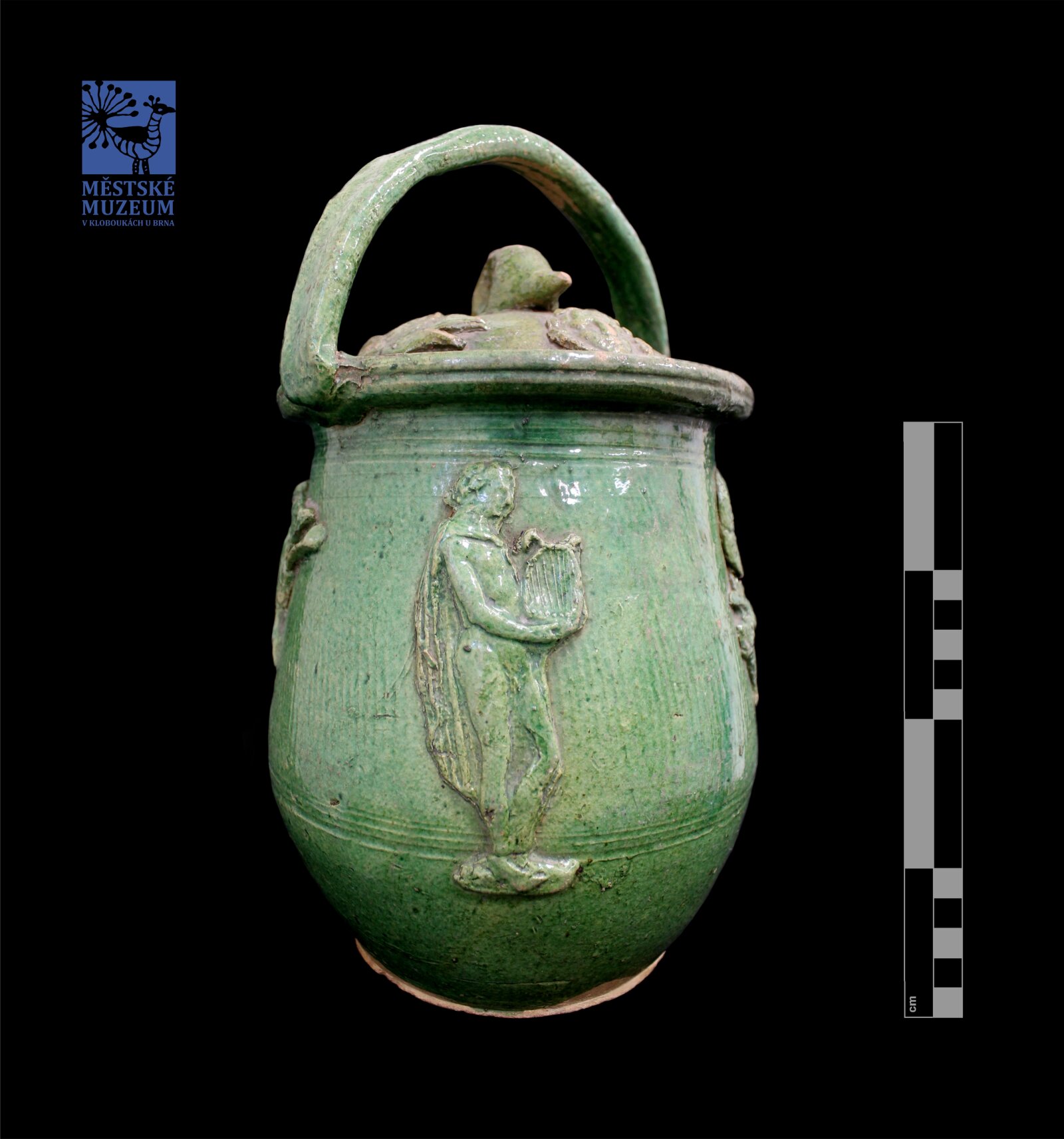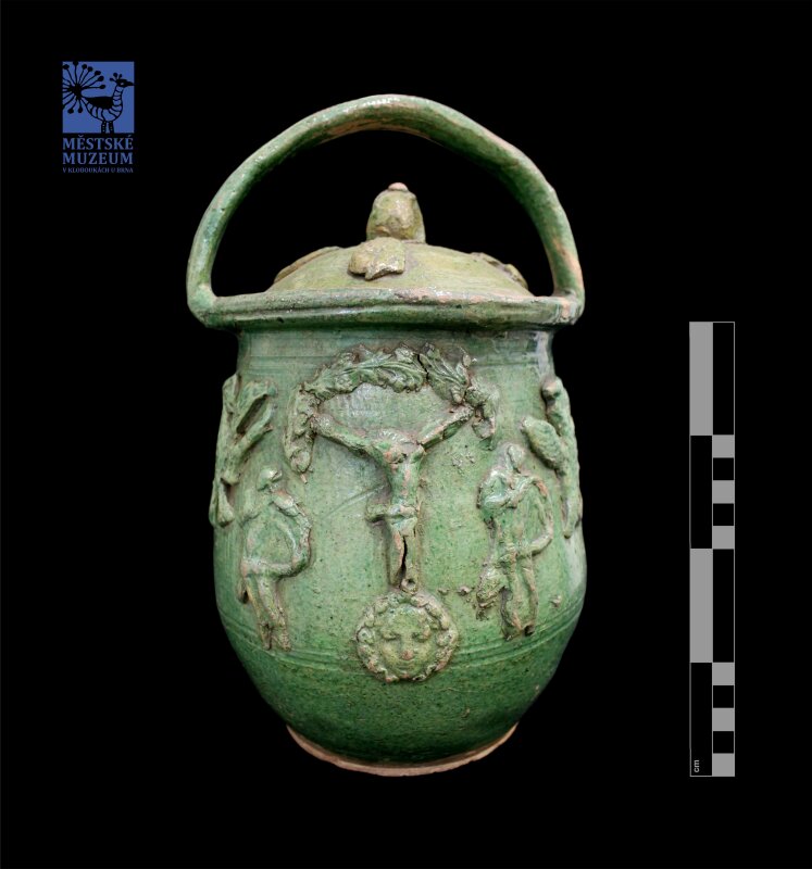 tzv. koutňák. hrnčina, střep hnědý, hruškovitý tvar, osazený rozevřený okraj, vysoký nepravidelný držák, bez patky. Víčko ploché s držákem ve tvaru kachní hlavy. Zelená glazura. Nalepovaný dekor, ryté šikmé kanelury: Krucifix, 2 andělé, 2 orlice, Apollon, květina.