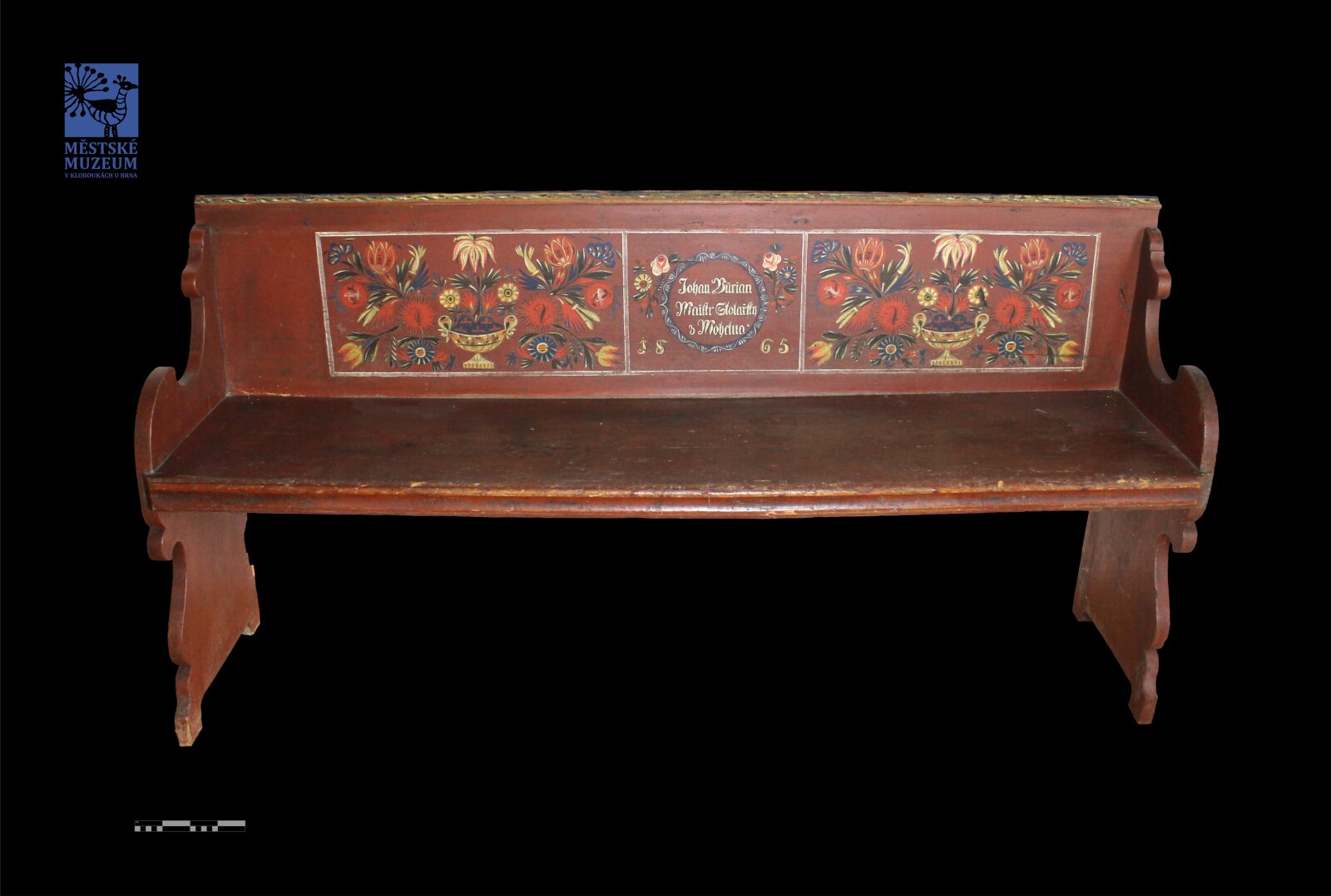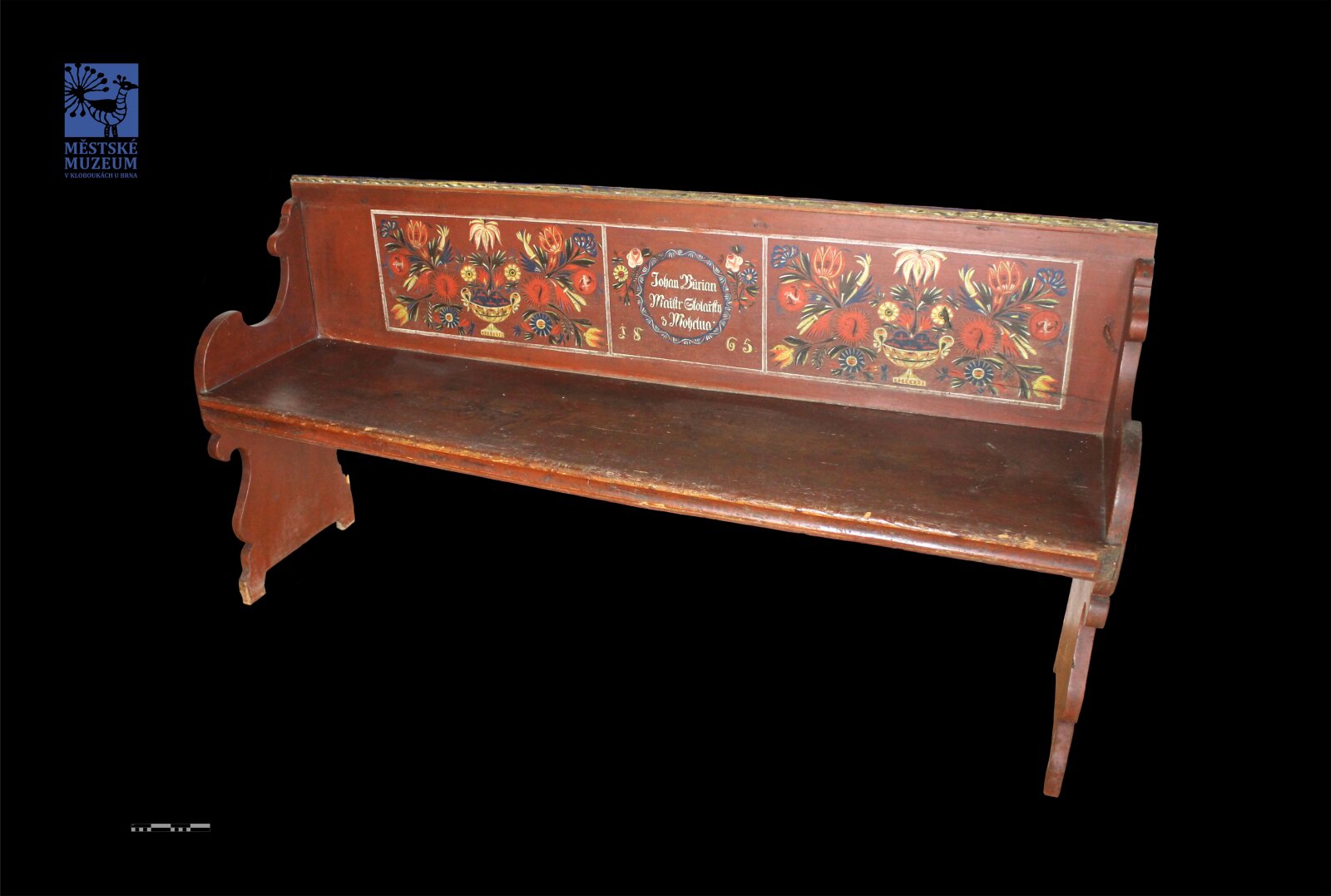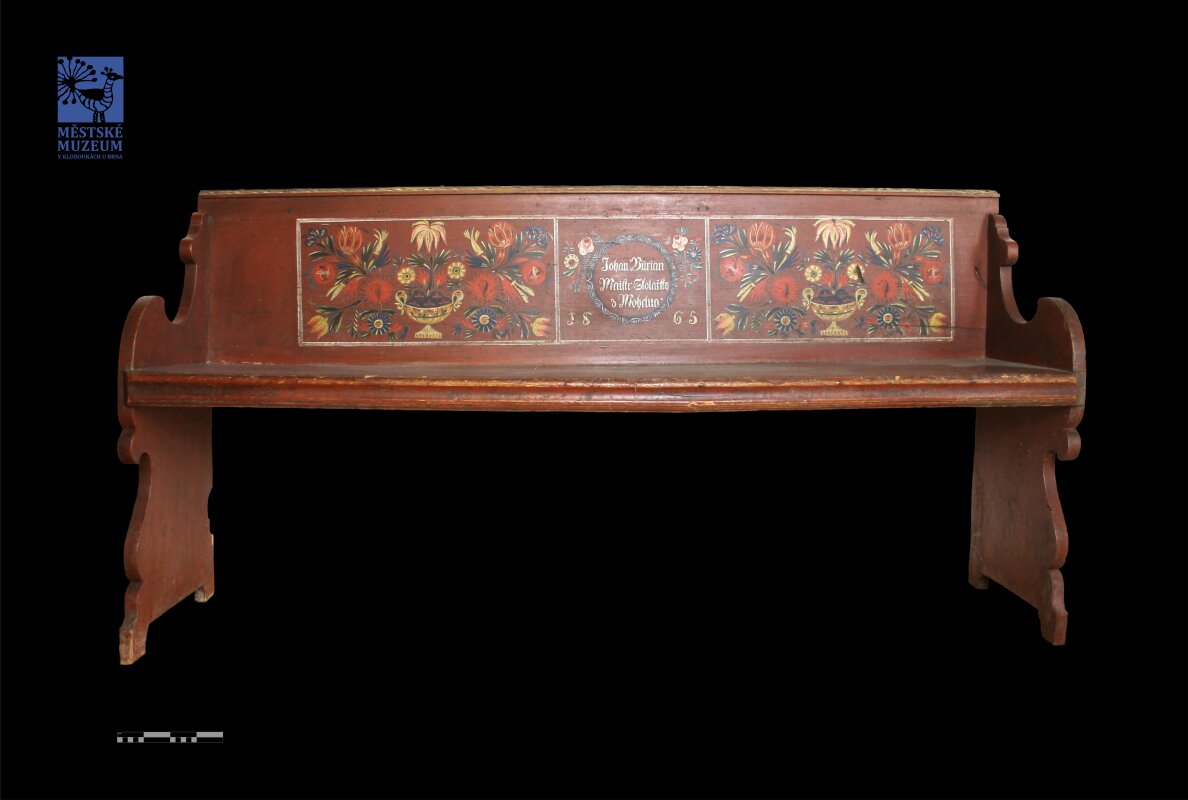 Polychromovaná lavice od stolařského mistra Johanna Buriana z Mohelna. Na cihlově červeném nátěru je zdobení v podobě florálního motivu (z vázy vyrůstajících květin). Florální motivy jsou soustředěny do tří obdélníků na opěradle lavice, obdélník je vymalován bílou barvou. V prostředním obdélníku je nápis: Johan Burian Maistr Stolařsky z Mohelna 1865.