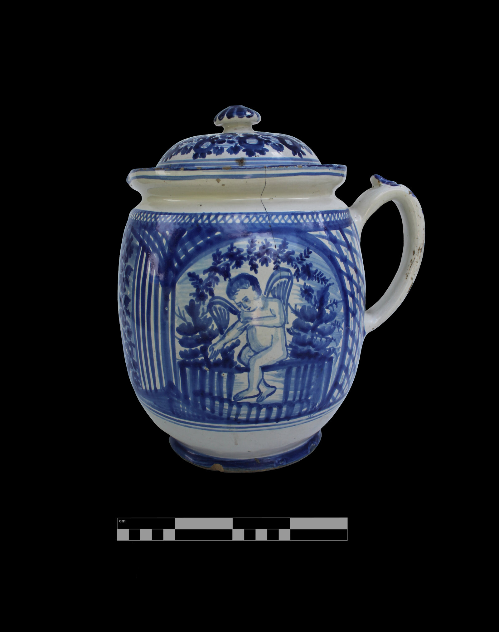 Fajánsová keranika hrncovitého tvaru s rozšířeným hrdlem s hubkou tzv. smetaník, klínovitá patka, ploché tažené ucho s držákem, poklička zvoncovitá s úchytkou. Dekor modro-bílý s figurálním motivem, po stranách dva andělíčci, vše doplněno geometrickým dekorem. Poklička zdobena kroužkováním a rostlinným věncem. Uvnitř prasklá glazura, otlučená patka a okraje pokličky