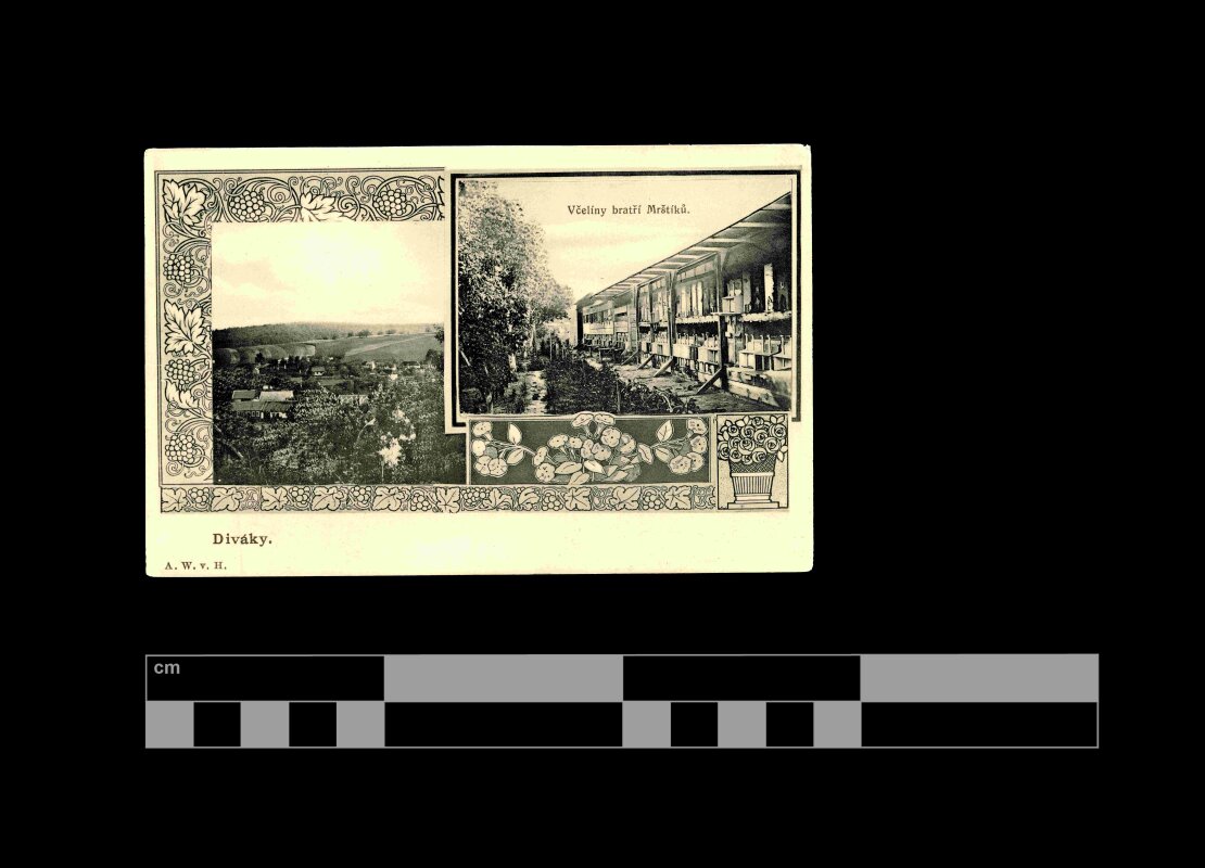 Na okénkové pohlednici jsou v rámečku s florálními motivy dvě fotografie. První snímek zachycuje včelíny bratří Mrštíků, druhá panorama obce Diváky. Pohlednici odeslal v roce 1908 Vilém Mrštík Antoníně Pitourové, odborné učitelce Vesny.