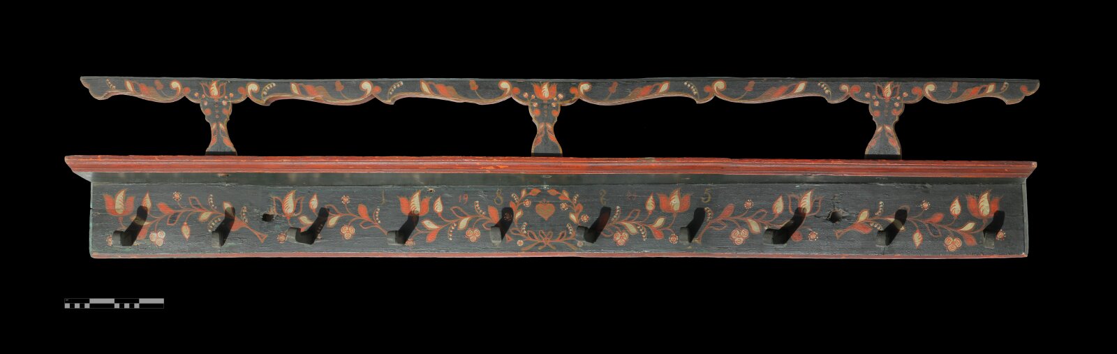 Závěsná malovaná police na hrníčky a talíře. Podkladová barva polychromie poličky je petrolejově zelená, pod ní prosvítají místa se světlejší zelenou. Na základové barvě je malovaný motiv tulipánových květů v barvách červené, bílé a tmavě žluté. Horná část je tvořena mírně vyřezávanou římsou (zábradlím) na uložení talířů. Do dolní desky pod římsou je začepováno deset (10) dřevěných kolíků (háčků) k zavěšení hrnečků. Na této desce uprostřed jsou také napsány dvě datace, a to větším žlutým písmem rok 1875 a menším červeným písmem 1925.