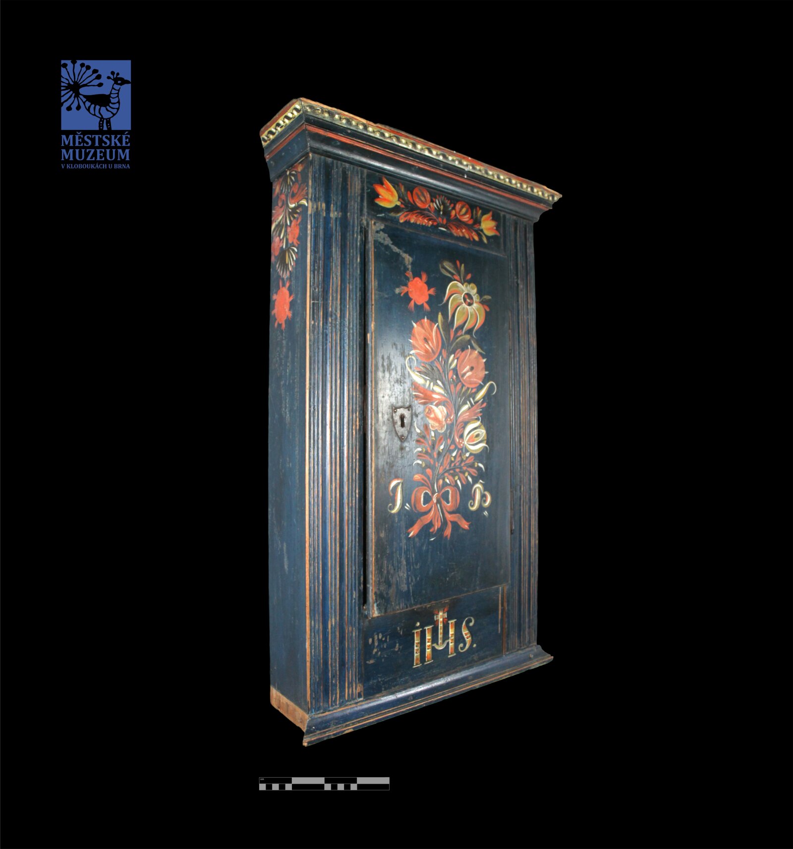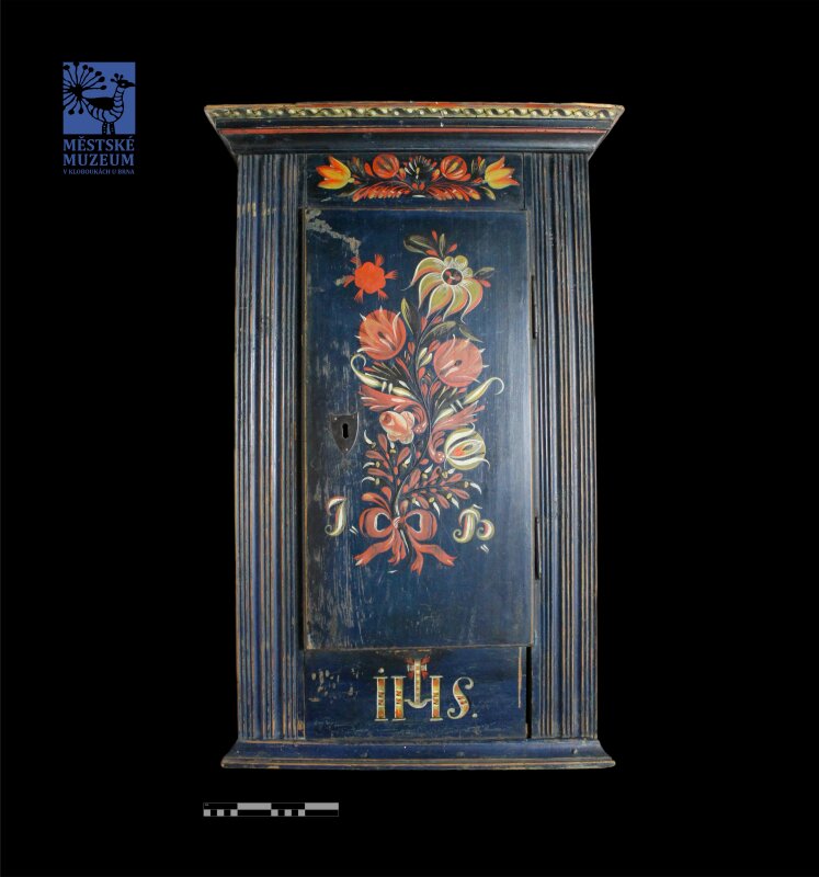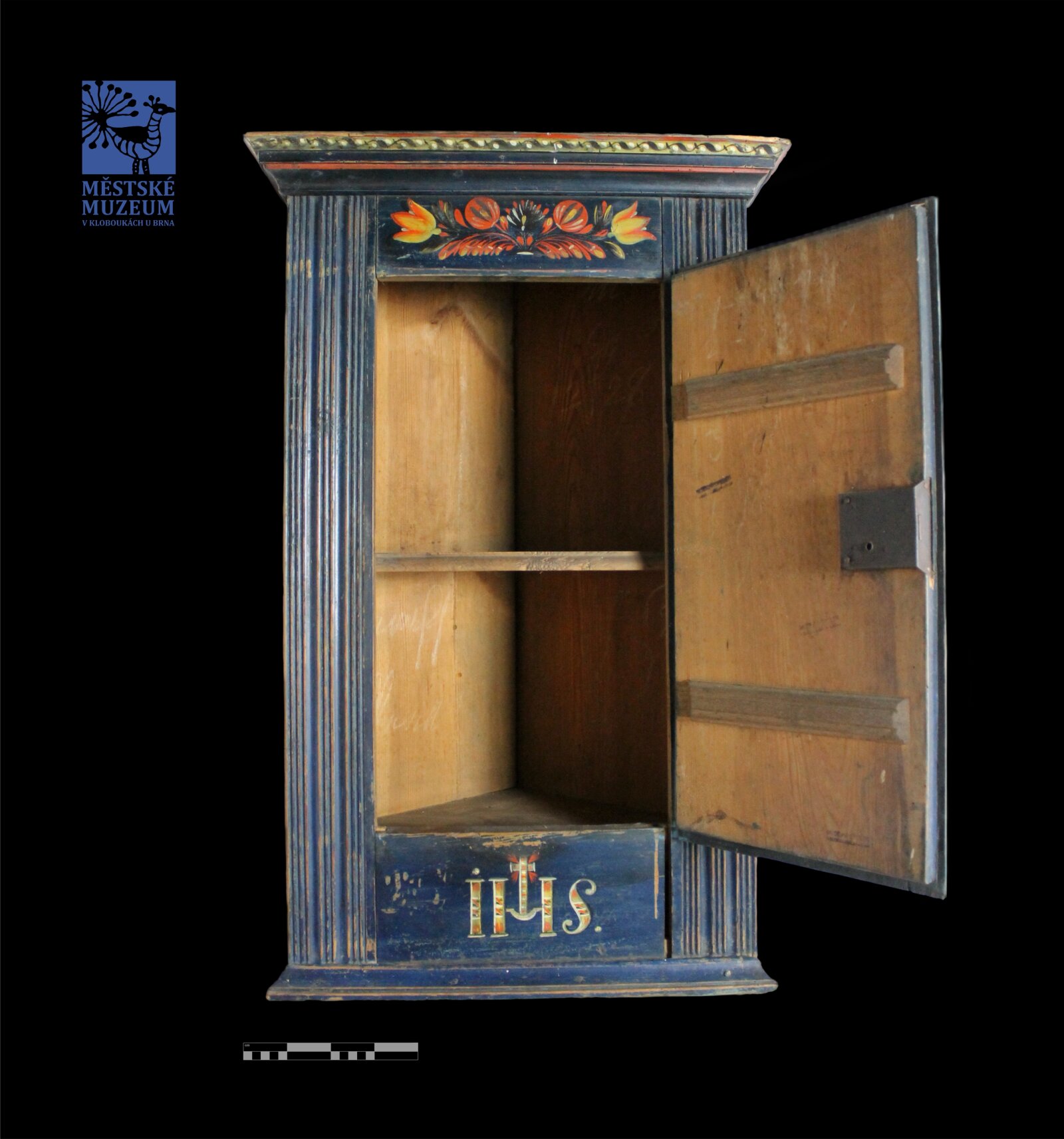 Modře polychromovaná závěsná rohová sktíňka, tzv. koutní skříňka. Dřevěná, s profilovanými lištami a hranami, dvířky na zámek, vnitřní prostor rozdělen poličkou. Na modrém podkladě je vzor soustředěn na čelní plochu.