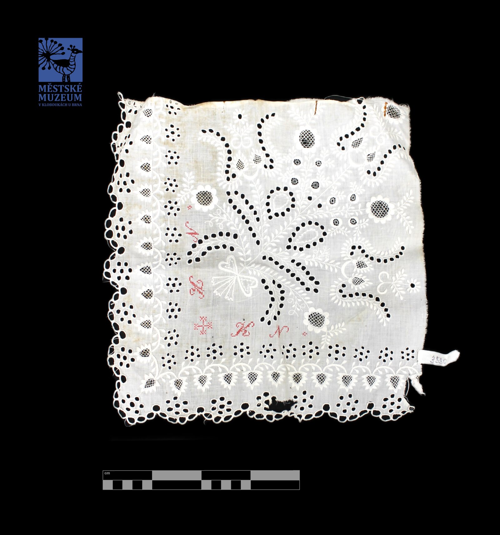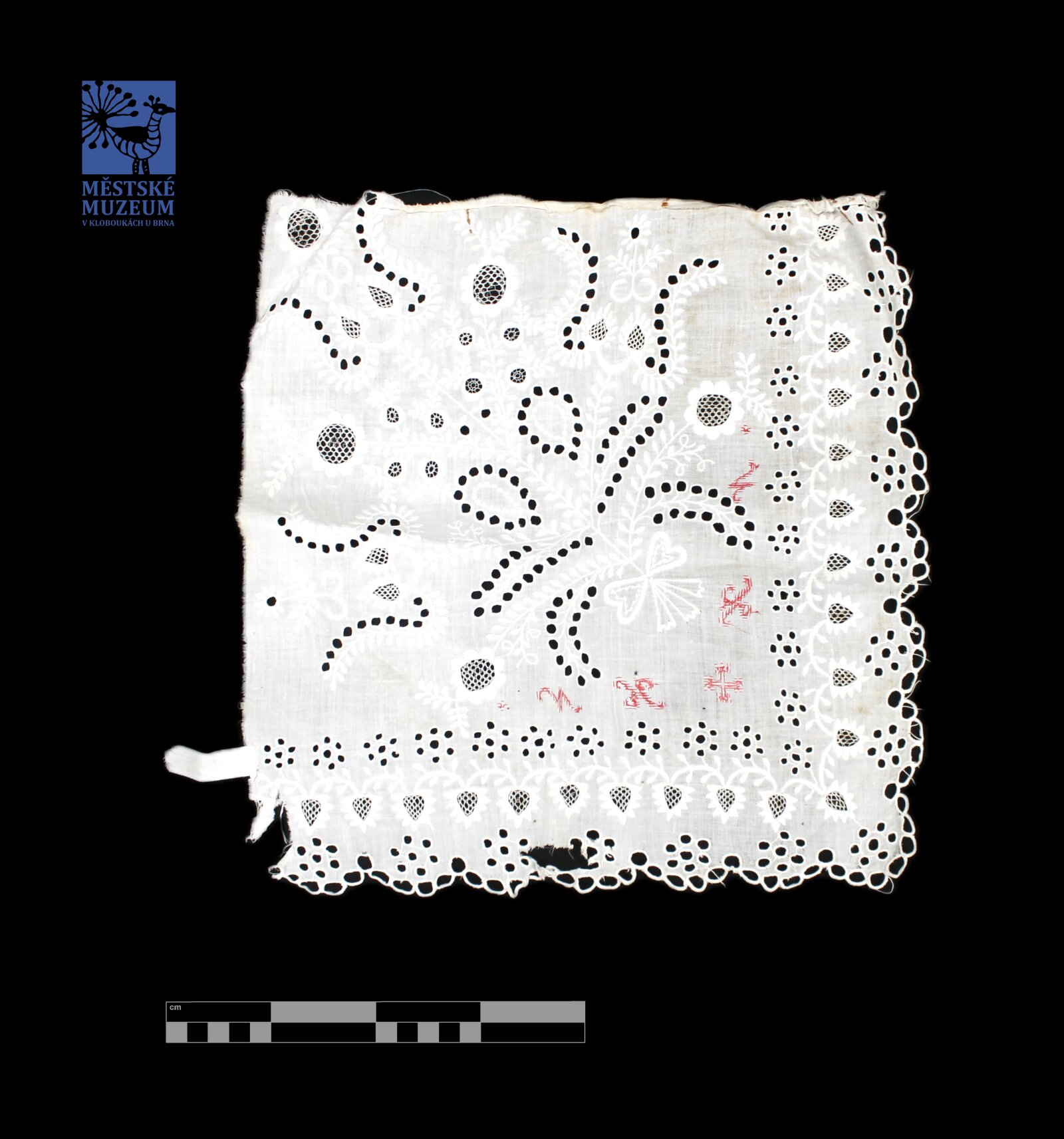 Útržek - cíp šaty (šatky). Ústřižek nejspíše šátku tzv. šatky. Vyšívaný bílou prolamovanou vyšivkou, iniciály (NK KN) jsou vyšity červenou bavlnkou.