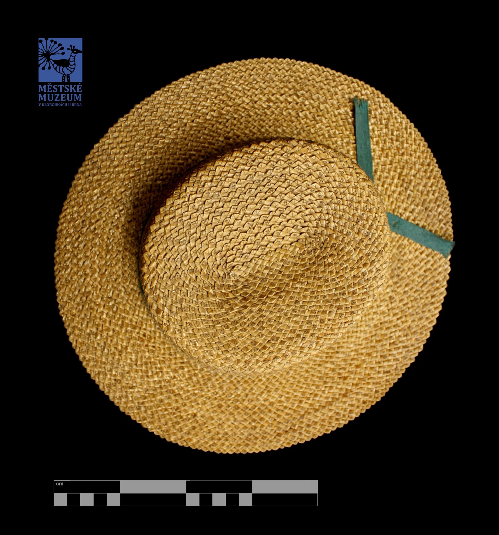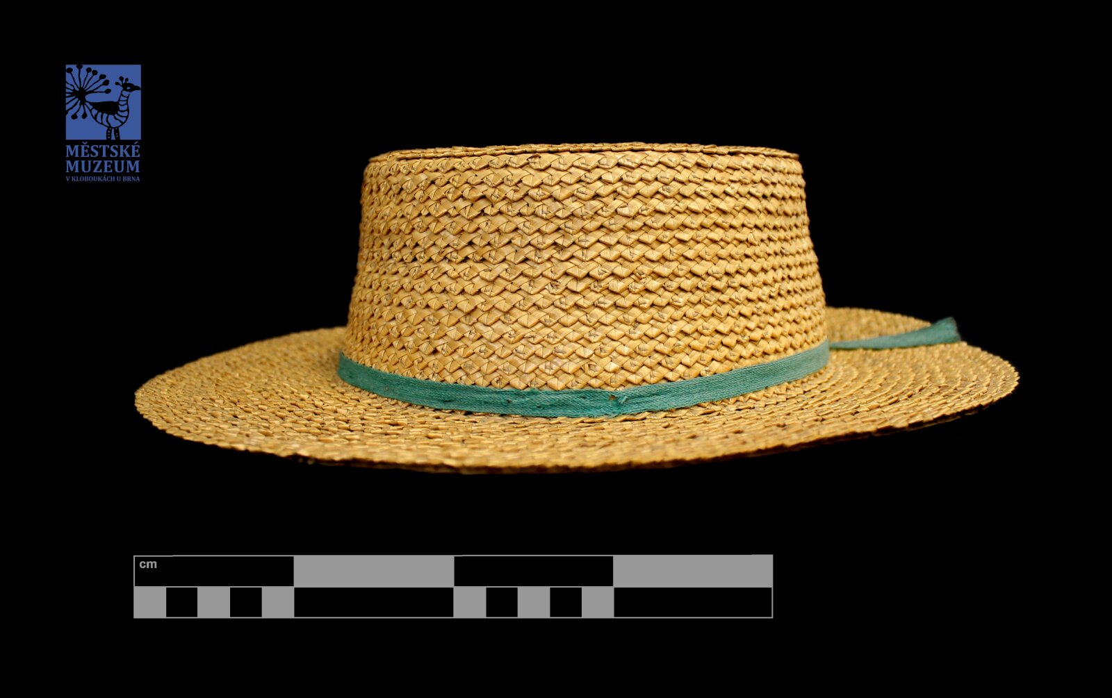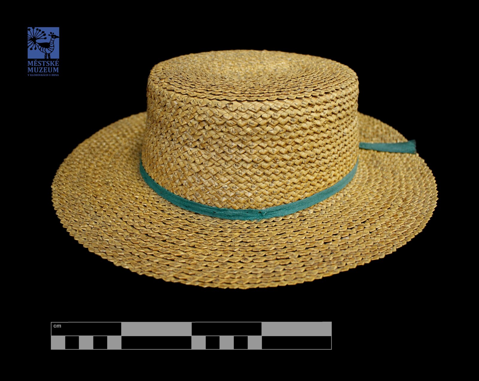 Klobouk ze slámy se zelenou stuhou.
