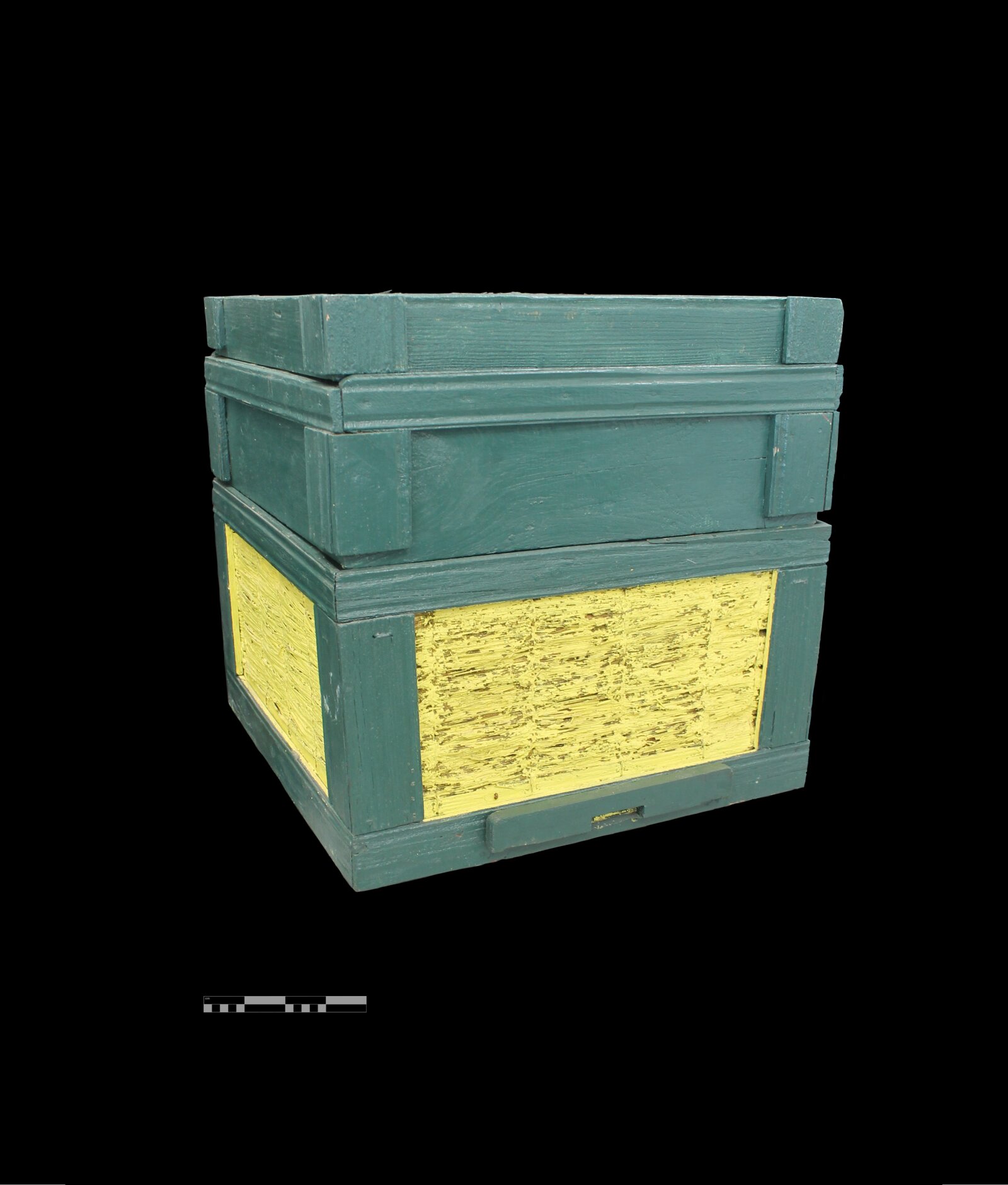 Dřevěná konstrukce je natřena zelenou barvou, slaměný výplet je natřen barvou žlutou (slaměný výlet víka je však také zelený. Zelené krmítko ve víku je přikryto kusem dřeva v barvě úlu a lze je vyjmout. Úl je plně obsazen rámky jak v plodišti, tak i v nízkém nástavku. Mezi plodiště a nástavek je vložena mateří mřížka, která však velikostí neodpovídá rozměrům nástavku. Úl je konturován pro teplou stavbu díla. Původně tento úl natírán barvou nebyl,[1] před konzervátorskými zásahy barva tmavomodrá (indigo) olejová.
