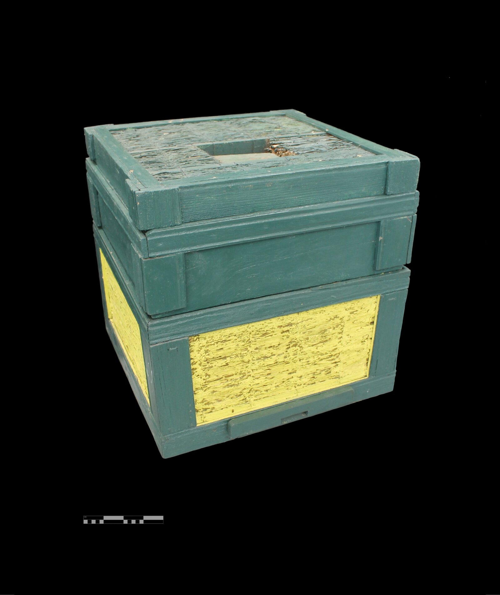 Dřevěný úl s rámovou slaměnou stěnou a víkem s jedním nástavkem, tzv. slamák.