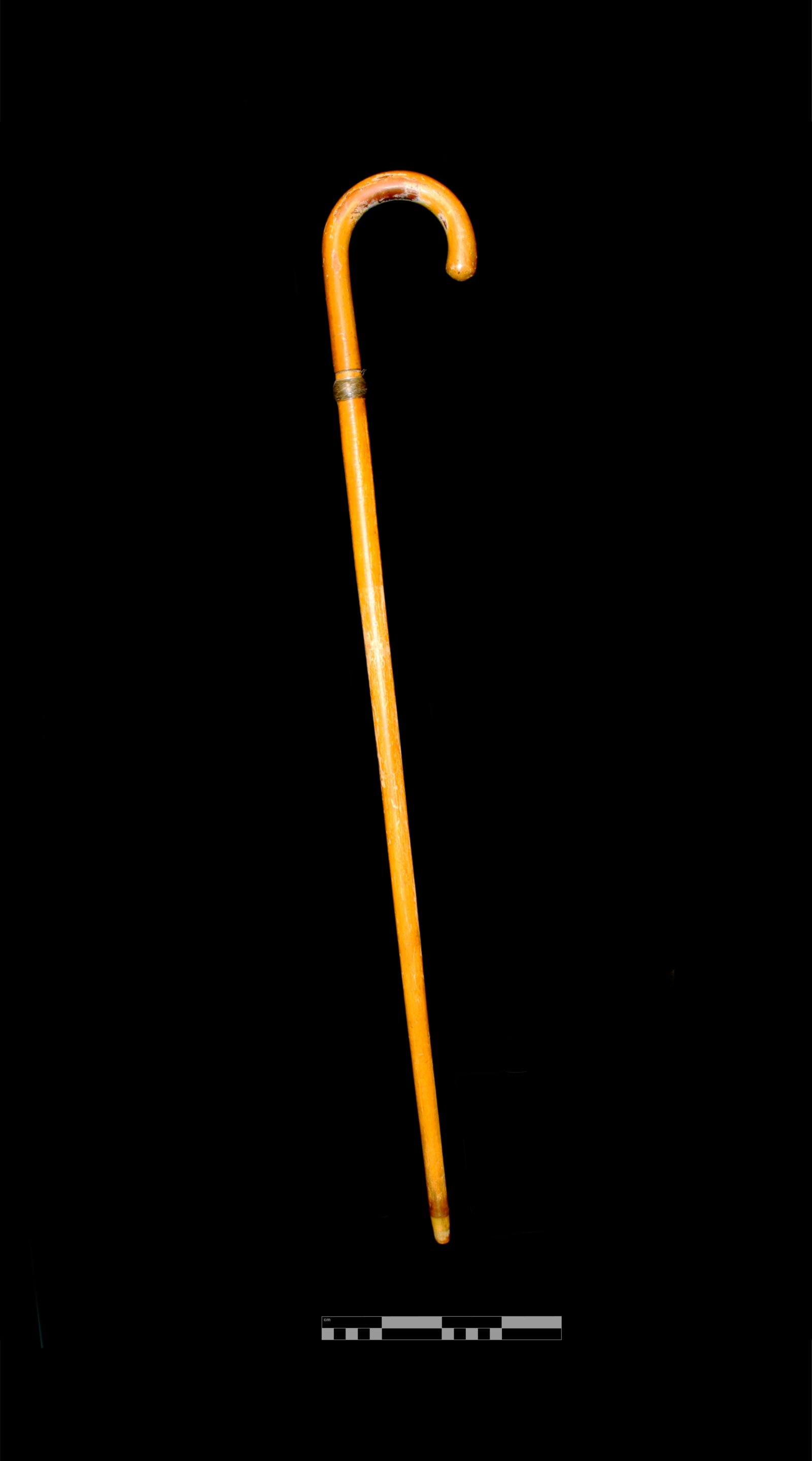 Vycházková hole se zahnutou rukojetí, dřevěná. Ze světlého dřeva, na povrchu olejový nátěr. Na horním konci tyče je prstenec spletených srátků (z barevného kovu). Ohnutou část lze oddělat vysunutím mosazného nádstavce z objímky (rovněž mosazné). Do tohoto trubkovitého nástavce je zapuštěné pletené ocelové lanko, na konci sletované a vsunuté do železného válcovitého nákončí. Lano i s mosazným nástavcem je ukryto v dutině hole. Spodní konec je opatřený kostěnou, mírně konickou botkou.