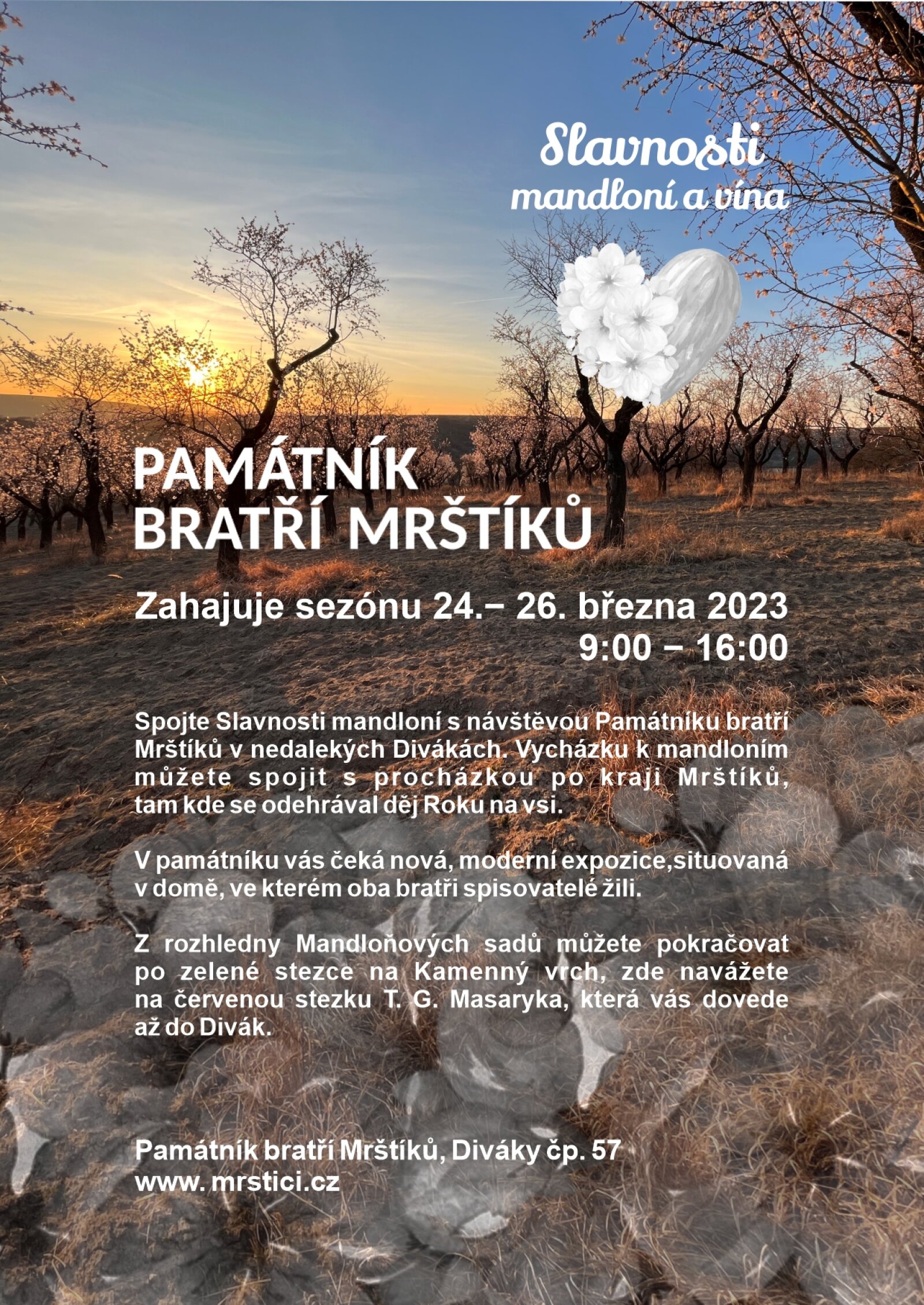 Spojte Slavnosti mandloní s návštěvou Památníku bratří Mrštíků v nedalekých Divákách. Vycházku k mandloním můžete spojit s procházkou po kraji Mrštíků, tam kde se odehrával děj Roku na vsi.